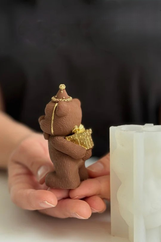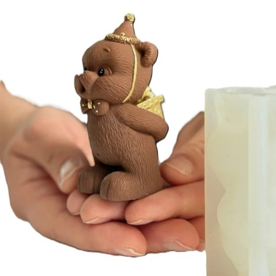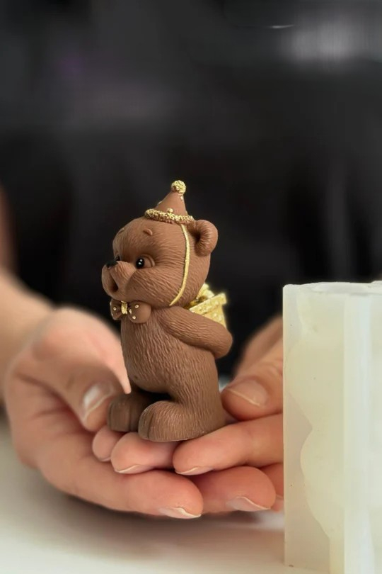 Un ursuleț adorabil purtând o pălărie de petrecere și papion auriu, ținând un cadou – perfect pentru orice sărbătoare! 🐻✨ Cu această formă din silicon poți crea o figurină realistă din ciocolată, care va deveni o decorațiune unică pentru torturi și deserturi.