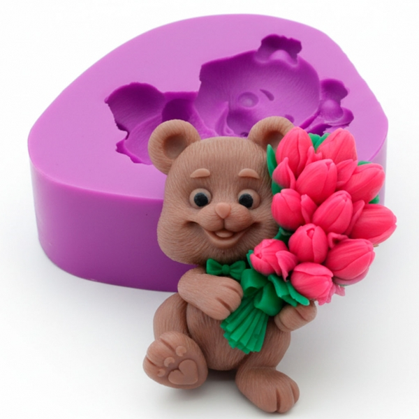 Matriță 2D din silicon pentru realizarea de săpunuri și lumânări decorative cu design de ursuleț și lalele. Este ideală pentru cadouri handmade și produse decorative.